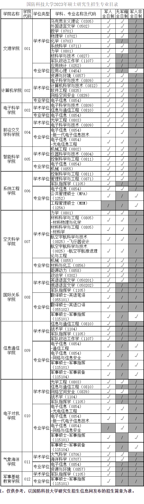 以上就是“2023考研專業(yè)目錄:國(guó)防科技大學(xué)2023年碩士研究生招生專業(yè)目錄”的全部?jī)?nèi)容!祝您考研成功!更多相關(guān)信息請(qǐng)持續(xù)關(guān)注本網(wǎng)站!