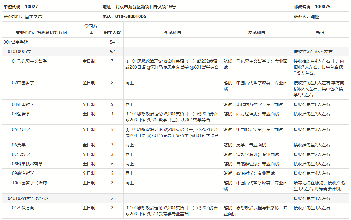 2025考研專業目錄:北京師范大學哲學學院2025年碩士研究生招生專業目錄